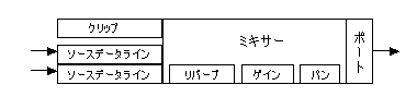 これは、この API でサポートできるミキサーの一例です。すべてのオーディオ構成に、図で示されているすべての機能があるわけではありません。個々のソースデータラインでパンをサポートしない場合や、ミキサーがリバーブを実装しない場合などもあります。