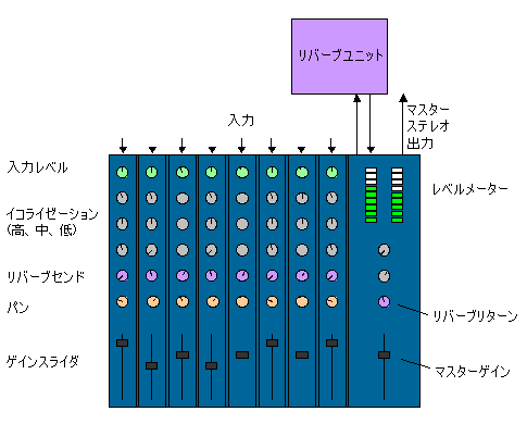 ライブコンサートのステレオ録音を思い出してみてください。ステージ上の多数のマイクや電子楽器から出ているケーブル (または無線接続) はミキシングコンソールの入力プラグに差し込まれています。それぞれの入力は、図に示すようにミキサーの別々のストリップにつながっています。音響技師が、ゲイン、パン、リバーブ調節の設定を決めます。すべてのストリップとリバーブユニットの出力が 2 本のチャネルにミキシングされます。この 2 本のチャネルは、ミキサーの 2 つの出力に送られます。この出力には、ステレオテープレコーダの入力に接続しているケーブルが差し込まれています。この 2 本のチャネルは、アンプを介して音楽の種類とホールの大きさに合わせて選択されたスピーカに送られます。